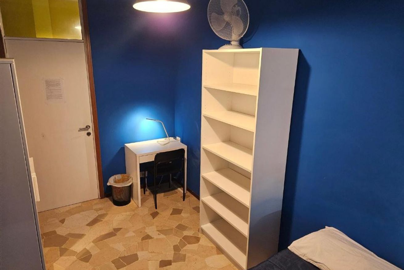 La camera singola di 14 m2 è composta da un letto singolo, armadio e cassettiera.